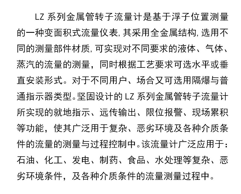LZ系列金屬管轉子流量計是基于浮子位置測量的一種變面積式流量?jì)x表,其采用全金屬結構,選用不同的測量部件材質(zhì),可實(shí)現對不同要求的液體、氣體、蒸汽的流量的測量,同時(shí)根據工藝要求可選水平或垂直安裝形式。