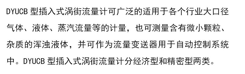 DYUCB型插入式渦街流量計可廣泛的適用于各個(gè)行業(yè)大口徑氣體、液體、蒸汽流量等的計量,也可測量含有微小顆粒、雜質(zhì)的渾濁液體,分經(jīng)濟型和精密型兩類(lèi)。