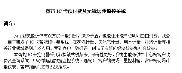 13、提示報警功能:汽、水量小于設定值控制箱會(huì )自動(dòng)發(fā)出報警,提示用戶(hù)及時(shí)充值。